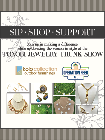 Join Kolo Collection to make a difference this holiday season at the Tonobi Jewelry Trunk Show. Discover beautiful, handcrafted jewelry pieces perfect for holiday gifting or a treat for yourself. 50% of all proceeds will go directly to Operation Feed ATL to help fight food insecurity in local schools.